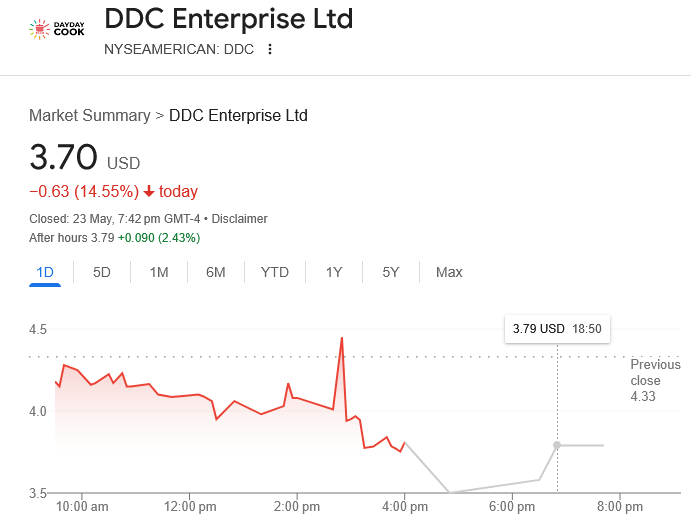 Реакція ринку на заяву DDC про біткоїн виявилася неоднозначною. Акції компанії впали на 14,5% під час регулярних торгів 23 травня, але відновилися з приростом на 2,43% у неробочий час, закрившись на рівні 3,79 долара. Незважаючи на це нещодавнє зростання, акції DDC залишаються нижчими більш ніж на 27% з початку року, що відображає ширший тиск на ринок.