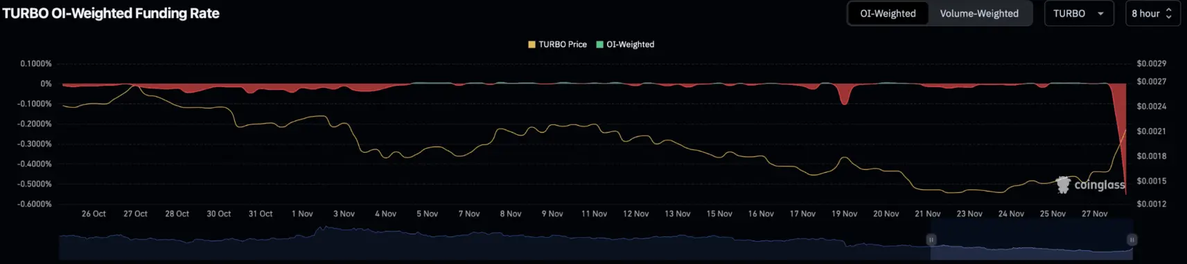 Dữ liệu từ OI–Weighted Funding Rate, thước đo phản ánh vị thế chiếm ưu thế trên thị trường phái sinh, lại cho thấy các trader đang nghiêng về xu hướng giảm. Hiện chỉ số này đã rơi xuống mức thấp nhất kể từ tháng 9 – một mốc từng gợi ý đáy ngắn hạn của TURBO trong quá khứ.