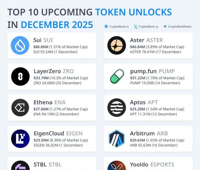 Theo dữ liệu thị trường, sự kiện mở khóa của SUI vượt xa tất cả các đợt phát hành sắp tới trong tháng này. Aster theo sát với đợt mở khóa trị giá $86.84 triệu vào ngày 17/12, trong khi LayerZero và Pump.fun dự kiến phát hành [image] triệu và $31.2 triệu token tương ứng. Arbitrum và Aptos cũng có mặt trong lịch phát hành tháng 12, nhưng không đợt nào sánh bằng quy mô mở khóa hoặc biến động giá của SUI trong tuần này.