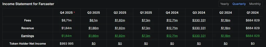 Ngồn: farcaster.xyz. Giao thức hoạt động trên các mạng L2 Ethereum, bao gồm Base. Doanh thu quý IV của Farcaster đạt $1,84 triệu, giảm 85% so với cùng kỳ năm trước.