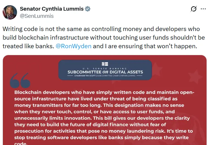 Các Thượng nghị sĩ Mỹ Cynthia Lummis và Ron Wyden đã giới thiệu luật riêng biệt nhằm đảm bảo rằng các nhà phát triển blockchain và nhà cung cấp dịch vụ không trực tiếp xử lý quỹ người dùng được miễn khỏi các quy định về truyền tiền.