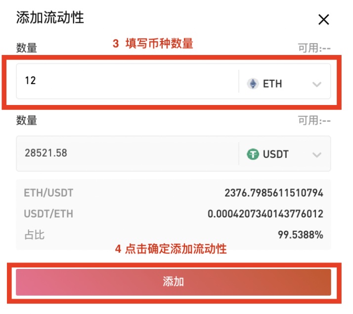 用户可在网页端的币币交易页面,在右侧【添加流动性】面板,输入币种数量,确认后点击确定添加,存入的流动性资产将由现货账户划入自动做市账户。
