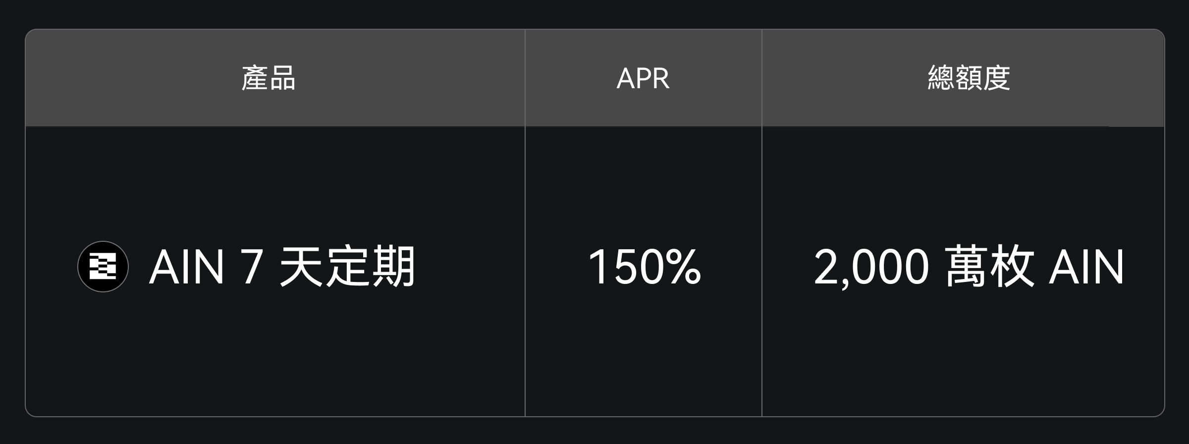 Gate 餘幣寶現已上線 AIN 7 天定期理財,年化收益 150%,總額度 2,000 萬枚 AIN,限量發售,先到先得。
