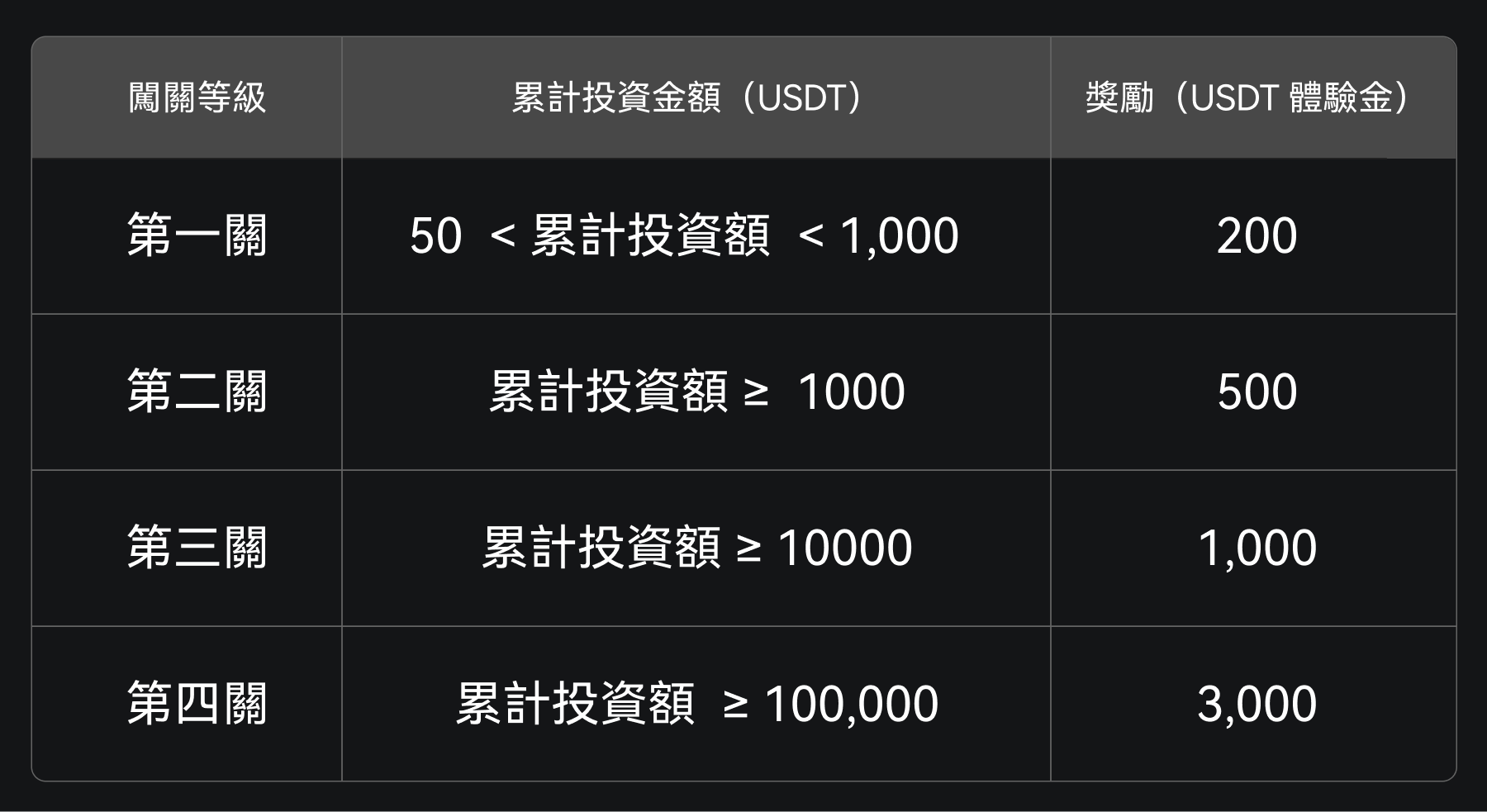 活動期間,用戶累計雙幣投資金額達到以下檔位即可獲得相應獎勵: