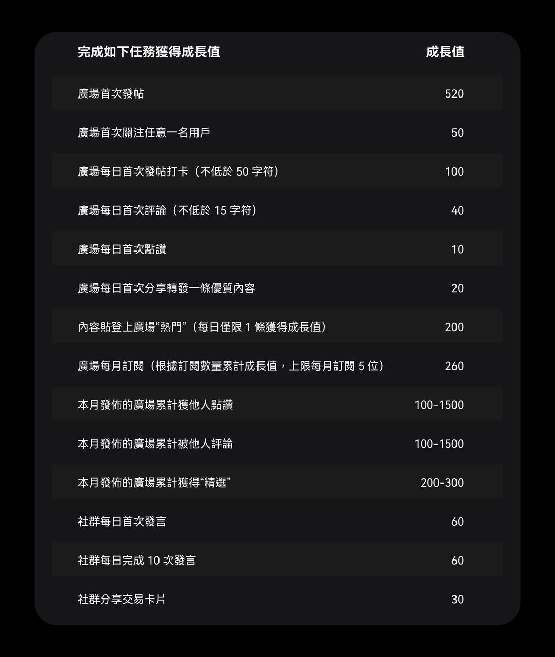 完成如下發文、留言、按讚、發言等任務,即可獲得對應的成長值。