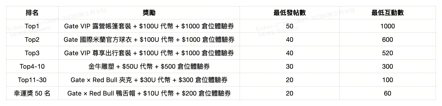 - 實體週邊獎勵將於活動結束後 14 個工作日內透過電子郵件及站內信通知得獎者。請於收到通知後 30 日內前往 Gate 週邊商城 填寫寄送資訊。逾期未填、資訊錯誤或無人簽收等情況,將視為自動放棄獎勵;寄送資訊提交後無法修改,請務必確認正確無誤。獎勵將於成功提交寄送資訊後 60 日內完成發放。如遇物流异常或奖品缺货等情况,實物獎勵將按以下標準轉換為倉位體驗券發放:Gate VIP 露營帳篷套裝:$2000 倉位體驗券、Gate 國際米蘭官方球衣:$1500 倉位體驗券、Gate VIP 尊享出行套裝:$1000 倉位體驗券、金牛雕塑:$500 倉位體驗券、Gate 新春禮盒:$500 倉位體驗券、Gate × Red Bull 聯名夾克:$300 倉位體驗券、Gate × Red Bull 鴨舌帽:$100 倉位體驗券。