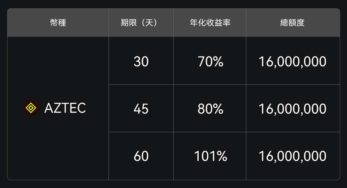 Gate 餘幣寶現已上線 AZTEC 定期理財,提供 30 天、45 天、60 天三種鎖倉週期,年化收益率最高可達 101%,最低僅需 50 AZTEC 起投,歡迎前往參與申購。