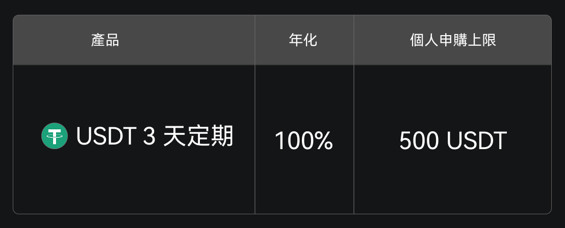 Gate 餘幣寶限時推出新人專屬理財福利,新用戶申購 USDT 3 天定期理財產品,即可享受 100% 年化收益。