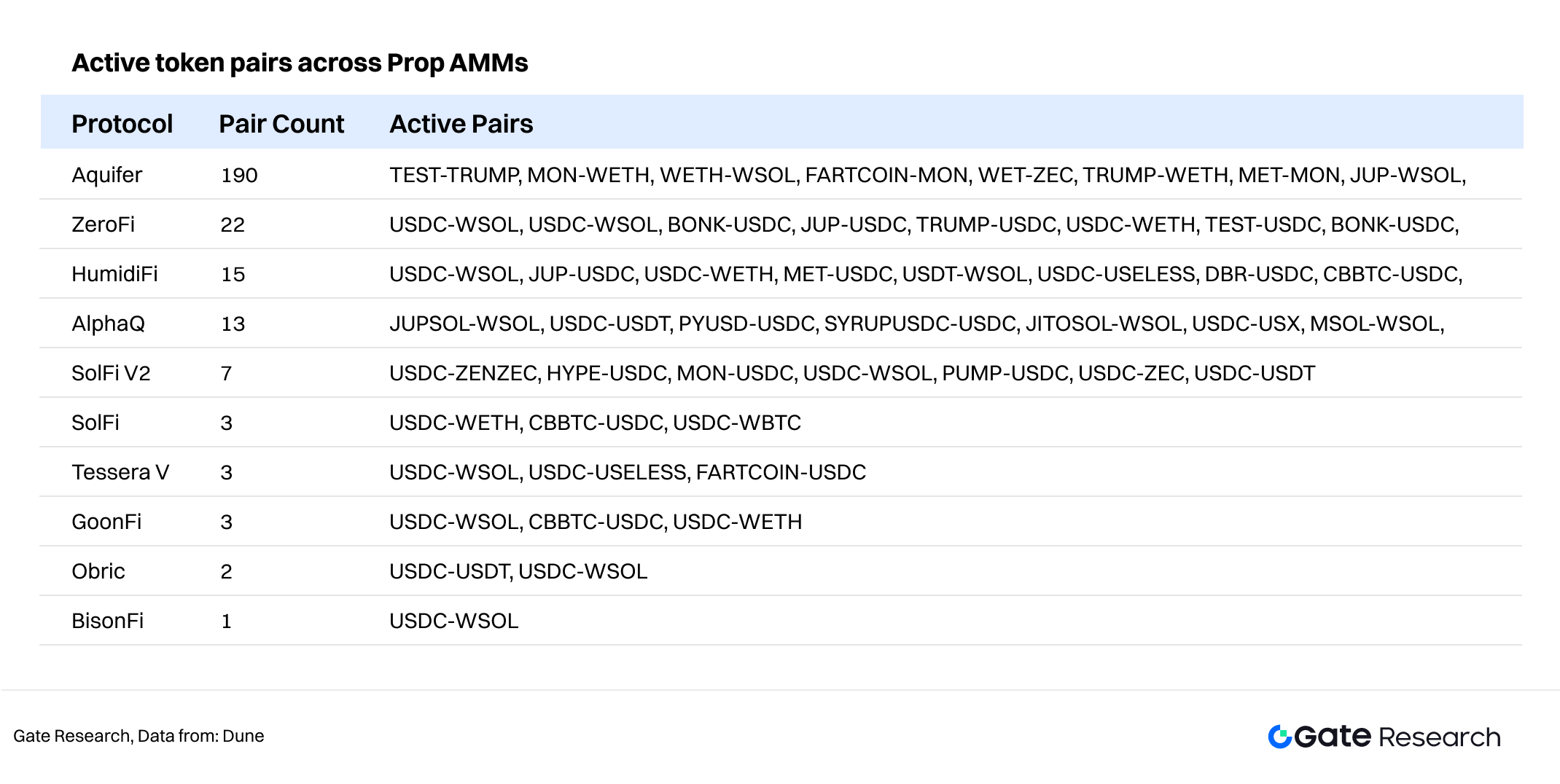 雖 Prop AMM 做市交易量主集中於 SOL-Stablecoins 核心交易對,但為爭奪聚合器路由優選與吸引更多訂單流,新協議嘗試提供更多長尾資產報價。9 月誕生的 Aquifer 報價高達 190 種交易對,超越其他 Prop AMM 服務總和。ZeroFi、HumidiFi、AlphaQ 同樣持續擴展服務邊界,如頭部 Memecoins(Fartcoin、USELESs 等)及跨鏈第三方資產(MON、ZEC 等)。