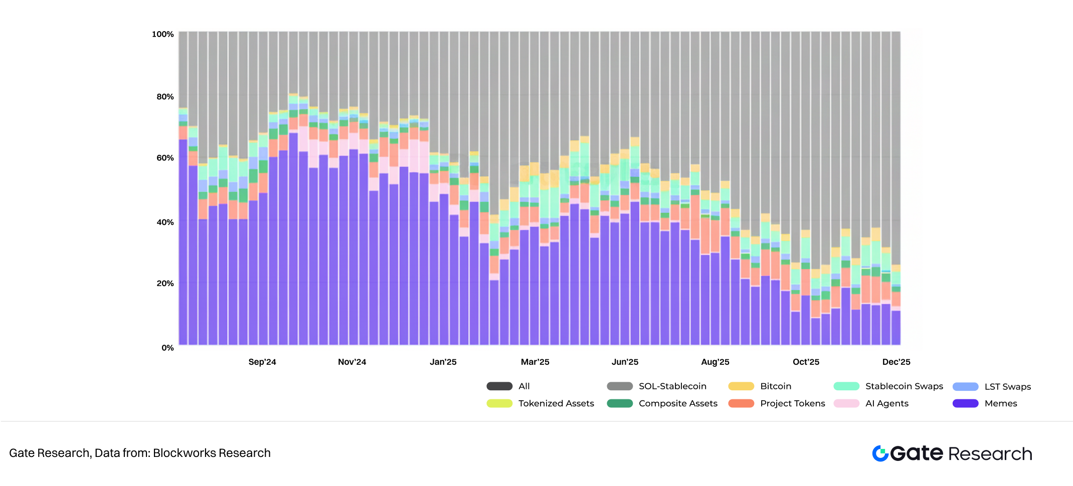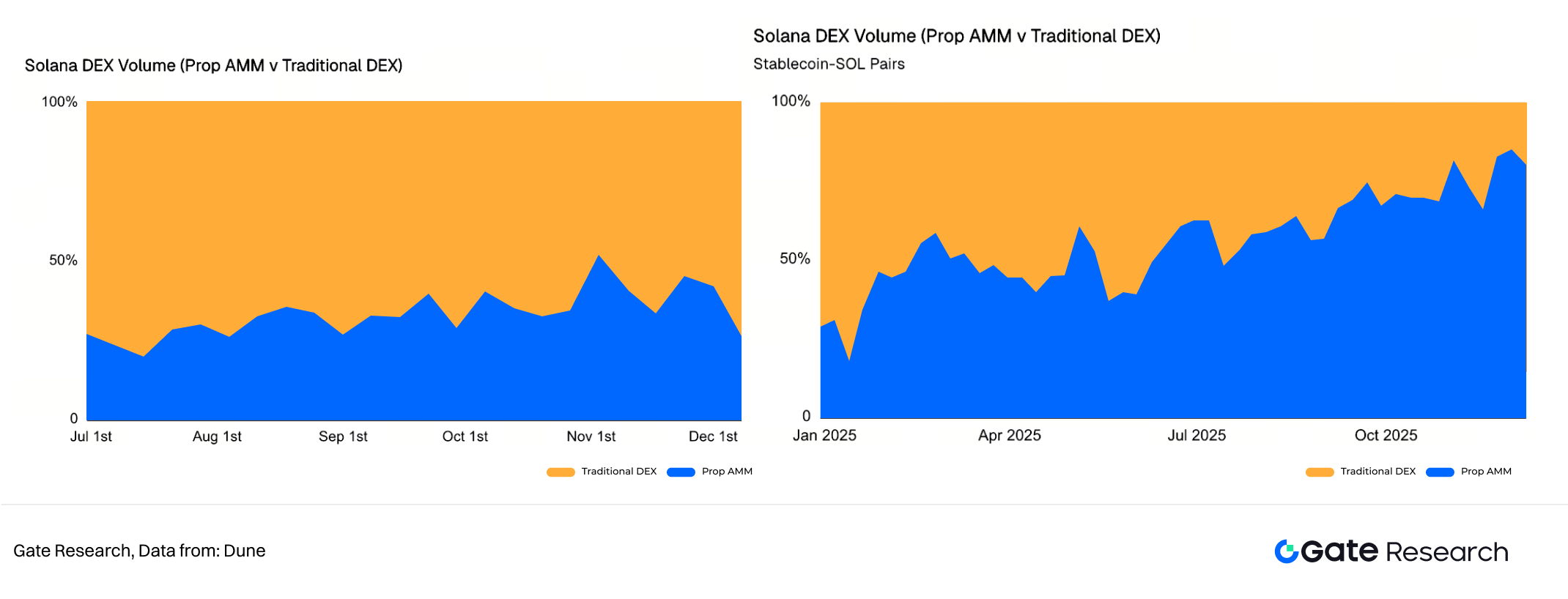 Prop AMM 崛起代表 Solana DEX 市場結構深刻變革。自今年以來,Solana DEX 交易結構由 Meme 投機轉向 SOL-Stablecoins,SOL-Stablecoins 現已穩定貢獻 60%-70% 交易量,為主動做市策略提供巨大空間。