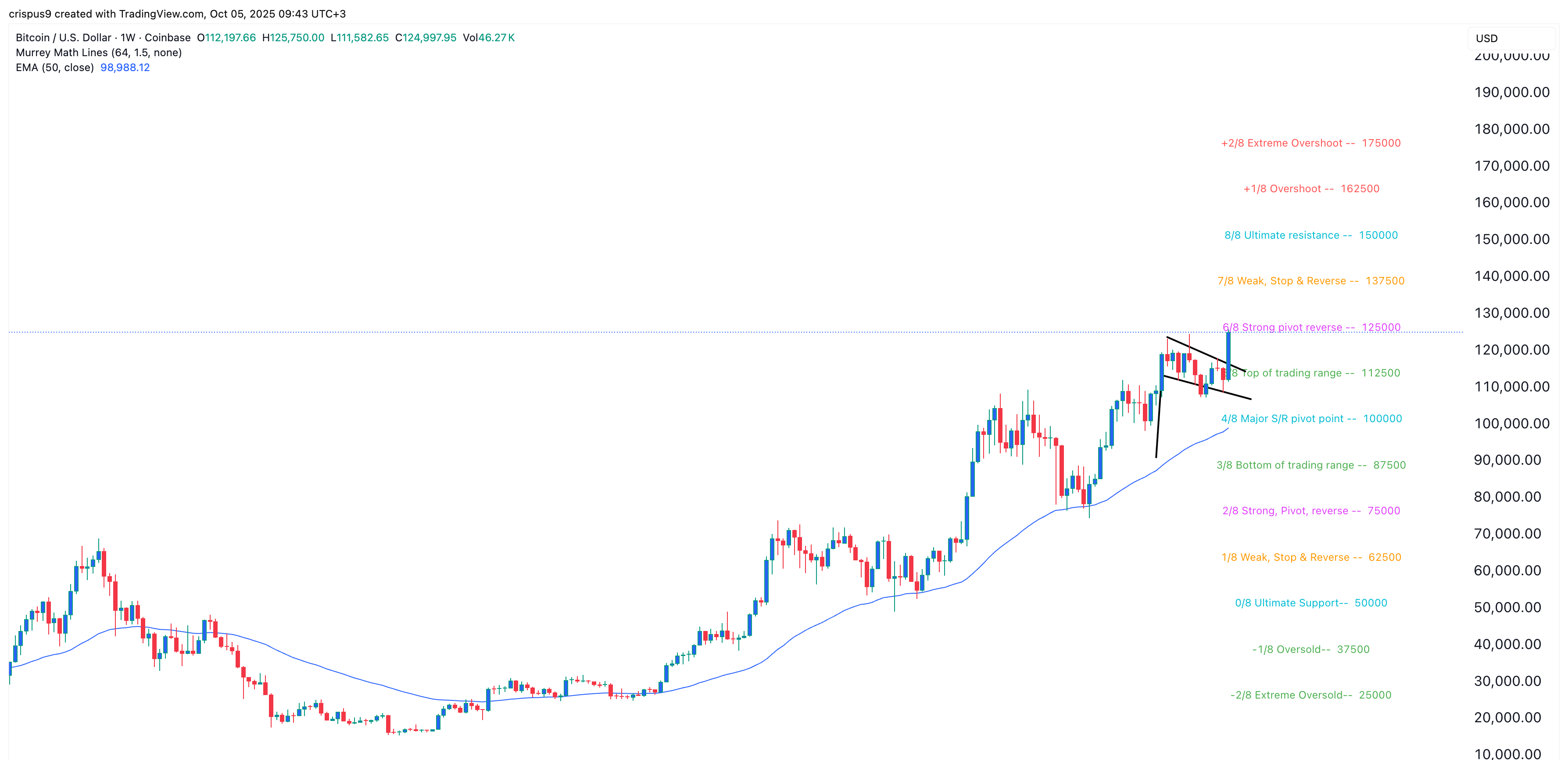 每週圖表顯示,今年BTC價格處於強勁的牛市中。目前,它已躍升至超過$125,500的創紀錄高位,遠離了牛市旗形圖案的上方。