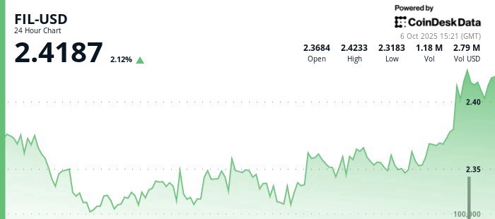 FIL$2.4140在過去24小時內上漲了2%,從$2.37上升到$2.42,依據技術分析模型。