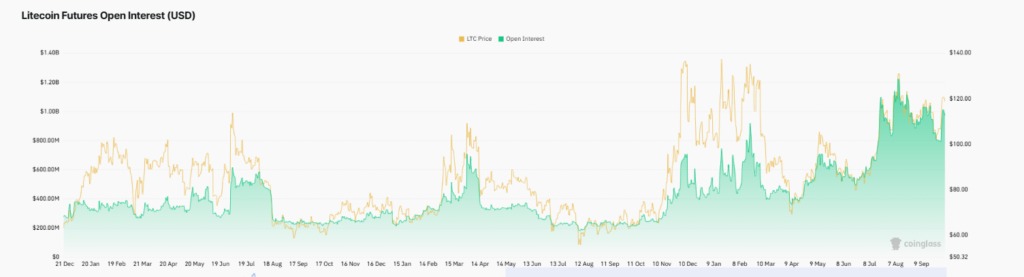 萊特幣期貨的未平倉合約已攀升至約10.1億美元,隨價格漲而增加;這種組合通常預示着波動性的加劇。![]()