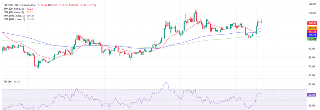 萊特幣 (LTC) 死拿 $118 支撐 作爲牛 $130 向上破位