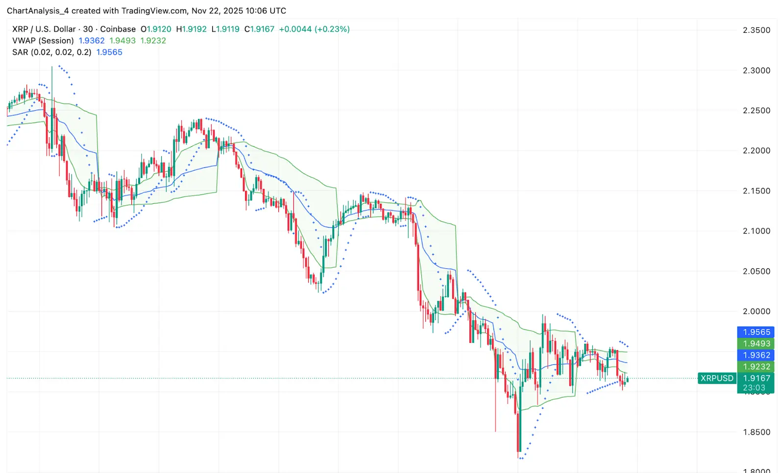 30 分鐘圖顯示,XRP 正試圖在 $1.91 附近築底。拋物線 SAR 點仍位於價格上方,表明賣方依然主導。VWAP 阻力位於 $1.94,限制了日內動能,多次突破嘗試均告失敗。