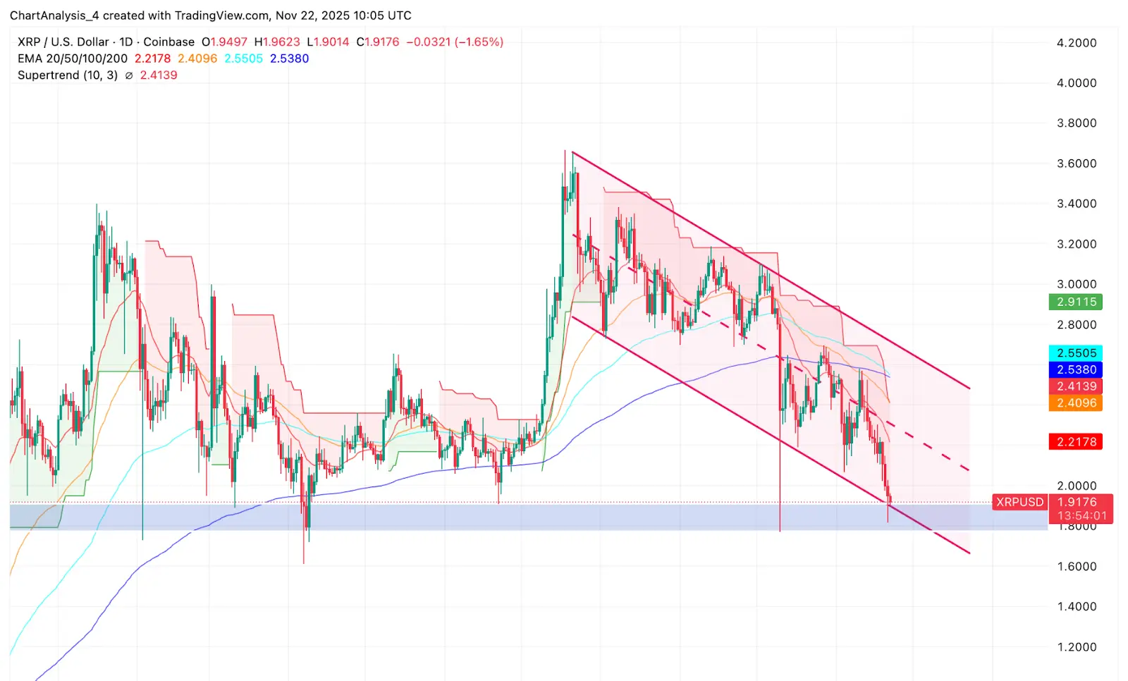 來源:CoinEdition 原標題:XRP 價格預測:隨著多月支撐位因大量資金流出而減弱,賣方目標指向 $1.75 原文連結:https://coinedition.com/xrp-price-prediction-sellers-target-1-75-as-multi-month-support-weakens-under-massive-outflows/ XRP 在跌至多月下降通道底部後,交易價格接近 $1.91。這一走勢使買方處於關鍵位置,因為該代幣正在測試今年早些時候多次守住的同一支撐區域。現貨資金流顯示持續疲軟,儘管 Ripple 在 Apex 大會上勾勒了積極的長期願景,賣方依然活躍。