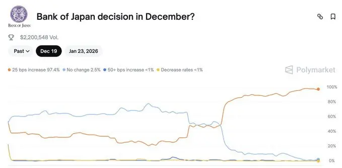 12月19日,日本銀行將召開一個重要的政策會議,普遍預期將加息25個基點。甚至預測平台Polymarket目前顯示12月19日加息的機率高達98%。