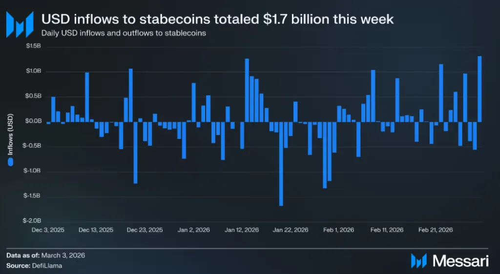 「穩定幣」的淨資金流入在一週內激增414.5%,達到17億美元。這是Messari分析師報告中的內容。