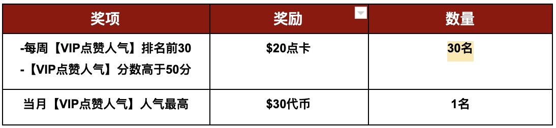 (1)每周【VIP点赞人气】奖励不重复发放。例如A用户第一周已获得奖励,第二周将不再纳入每周【VIP点赞人气】排名