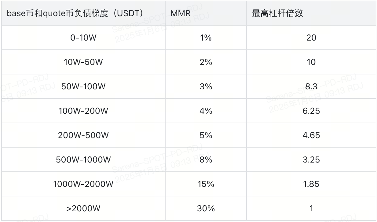 当用户对BTC/USDT负债的美元价值超过2000W时,最高可开杠杆倍数是1,此时用户不可以再持有更多负债;