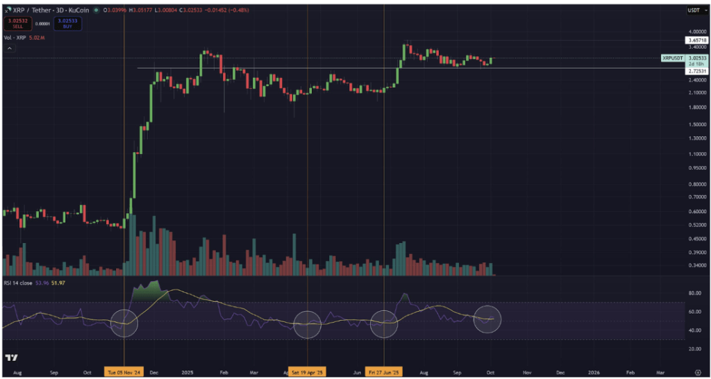 XRP目前的交易价格为$3.02。图表:TradingView然后来到了2025年6月,当时同样的RSI和蜡烛图形态第三次出现,此时XRP的3日蜡烛图收盘价站稳在$2.2以上。这一次的信号比4月的更为重要,最终导致了新的历史最高价$3.65。