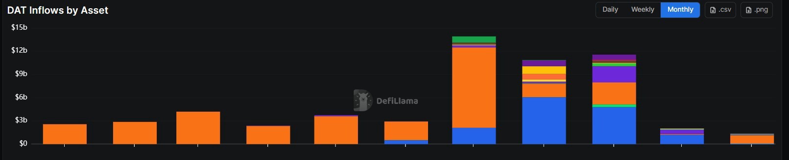 数据聚合器DefiLlama的数据表明,在11月,DATs的流入量仅为13.2亿美元,这是该行业今年最低的月流入量。这比10月份的19.9亿美元下降了34%,比9月份的115.5亿美元下降了88%。