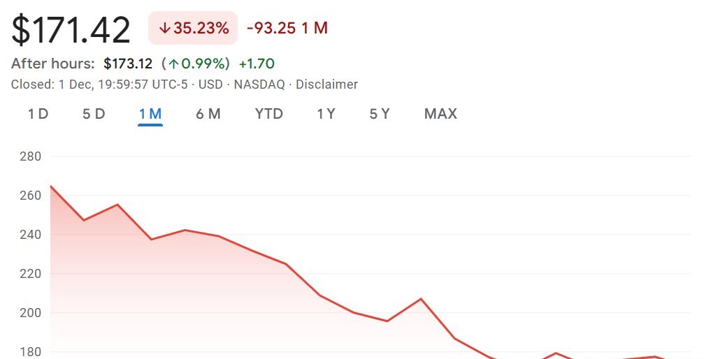 Strategy的股票在一个月内下跌了35%。来源:Google财经