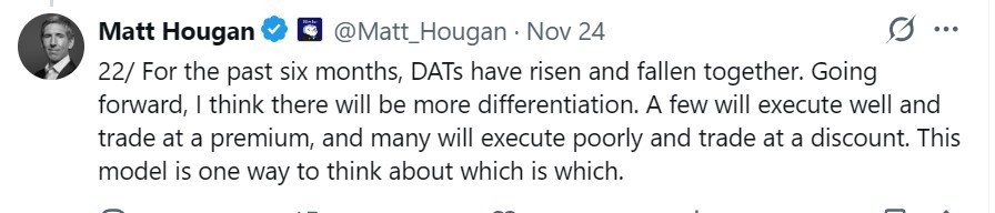 Bitwise首席投资官Matt Hougan表示,过去六个月显示DATs往往同步移动,一起上涨和下跌。