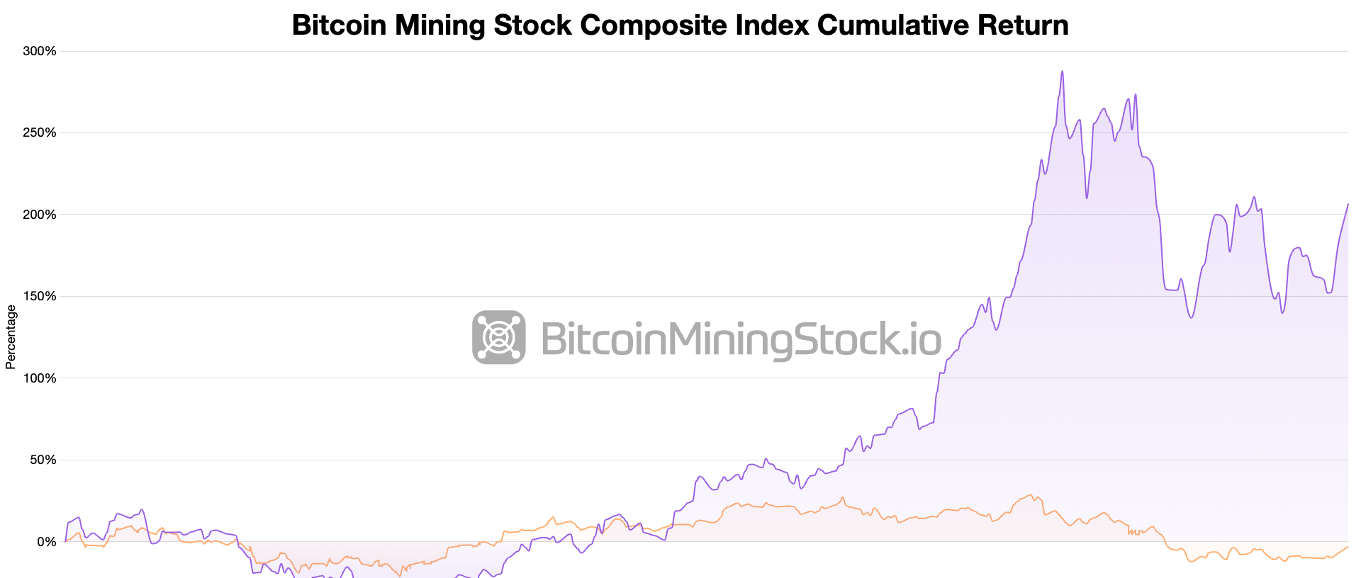 这种放大效应在一个简单的投资对比中变得尤为明显:用等同于1个比特币的资金投资比特币,用相同的美元金额投资矿业股指数。虽然比特币在上半年表现优异,但到了下半年,局势发生了戏剧性的逆转。年末,比特币的回报为**-9.71%,而矿业股指数则实现了惊人的+152.34%**的涨幅。