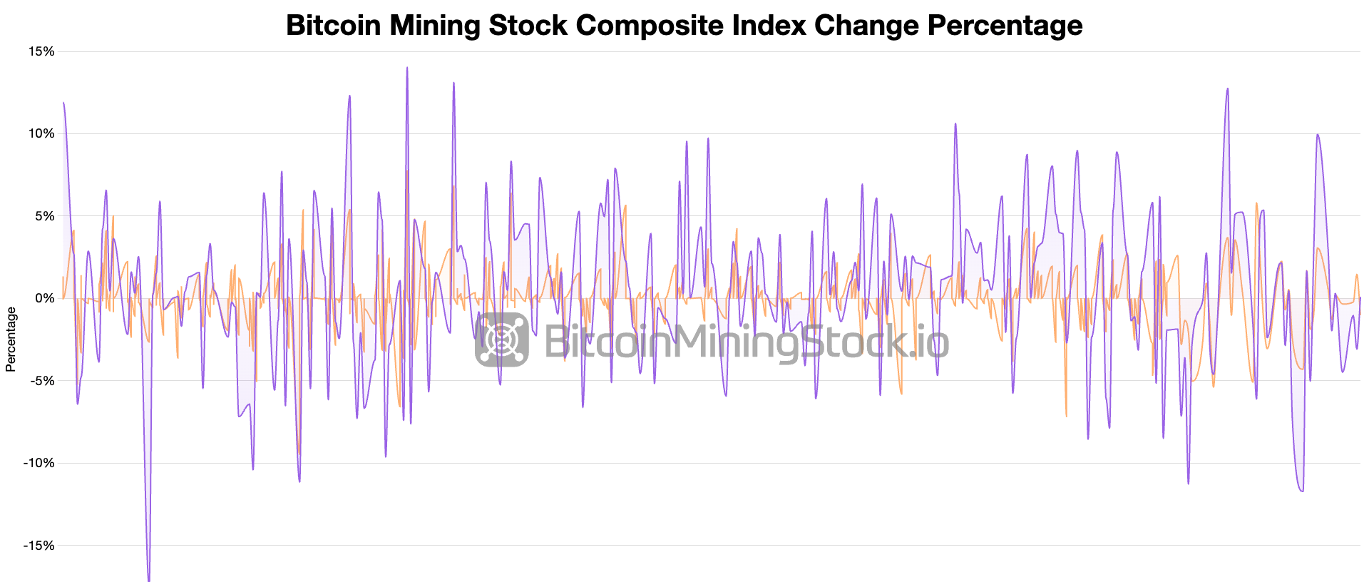 按百分比变化计算,矿业股的走势基本与比特币保持一致,但波动性明显更高。这强化了它们作为比特币高贝塔代理的角色,在比特币波动时,矿业股的变动往往被放大。