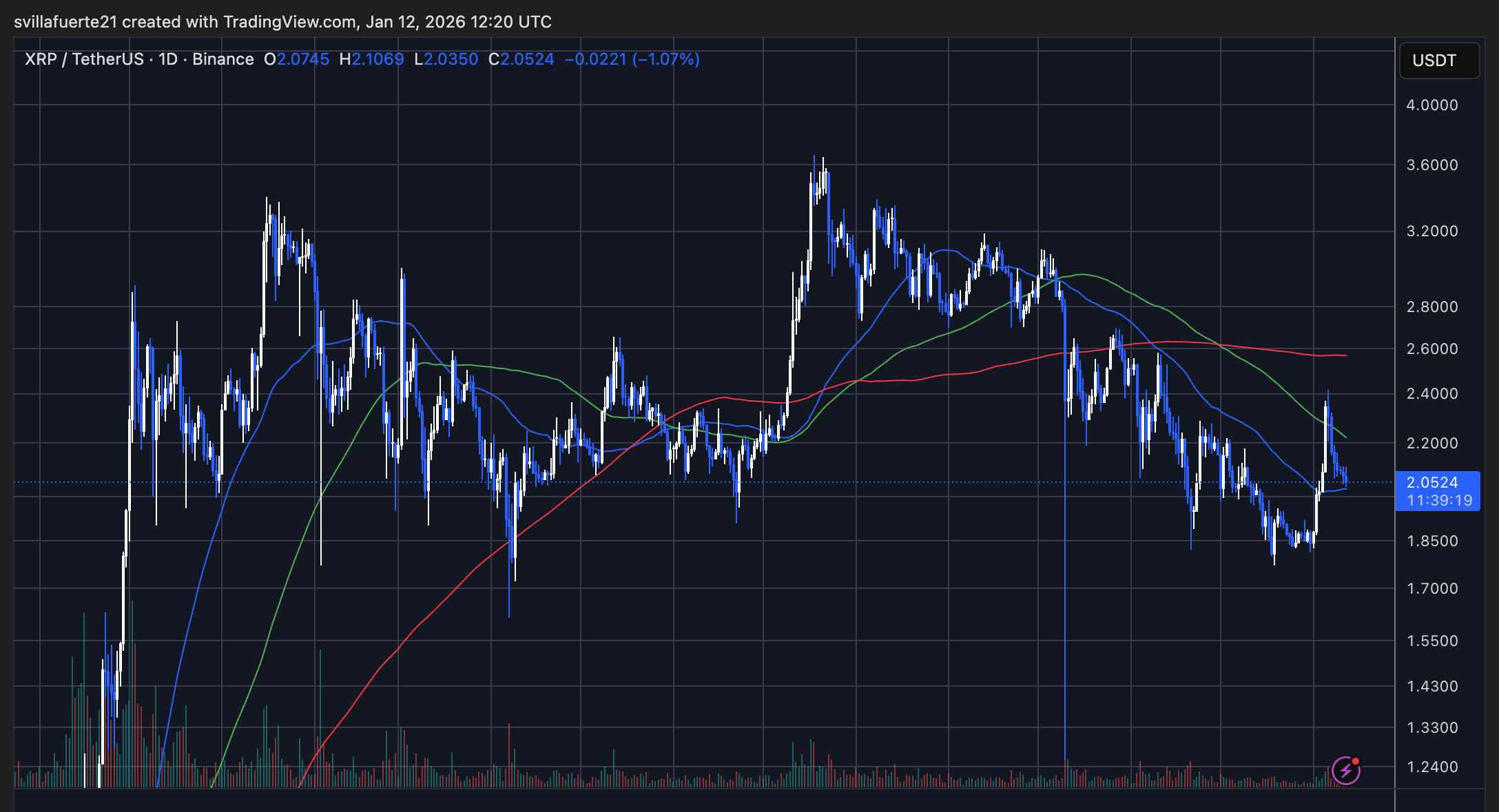 如日线图所示,XRP目前在$2.05附近交易,经历了长时间的抛售压力。近期从低于$1.90的水平反弹,表明买家正试图捍卫心理关口$2.00,该水平在整个周期中一直是重要的支点。然而,价格走势仍然结构性疲软,XRP仍然在其主要均线以下交易。