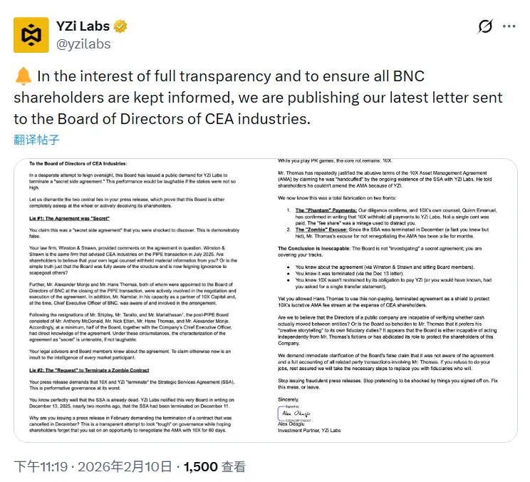 ChainCatcher 消息,YZi Labs 发布致 CEA Industries 董事会的信函表示,CEA Industries 称与 YZi Labs 存在“秘密协议”,完全不实。协议的内容董事会早已知情,律师事务所 Winston & Strawn 亦提供意见,董事会成员 Alexander Monie、Hans Thomas 以及当时的 10X Capital CEO Namdar 全程参与。所谓“秘密”只是误导公众的说辞。